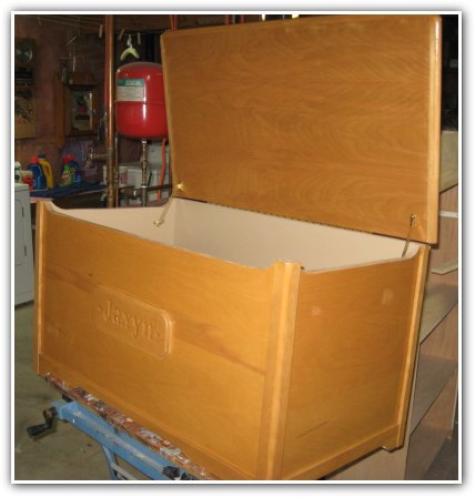 The chest on the right is a pine chest with cedar lining which gives it a great aroma and good for storing keepsakes. It has a natural clear finish which shows off the beautiful grains in the pine. Instead of cedar interior the bottom toy chest is painted for a tougher finish. The exterior has a light stain and clear finish on birch plywood.